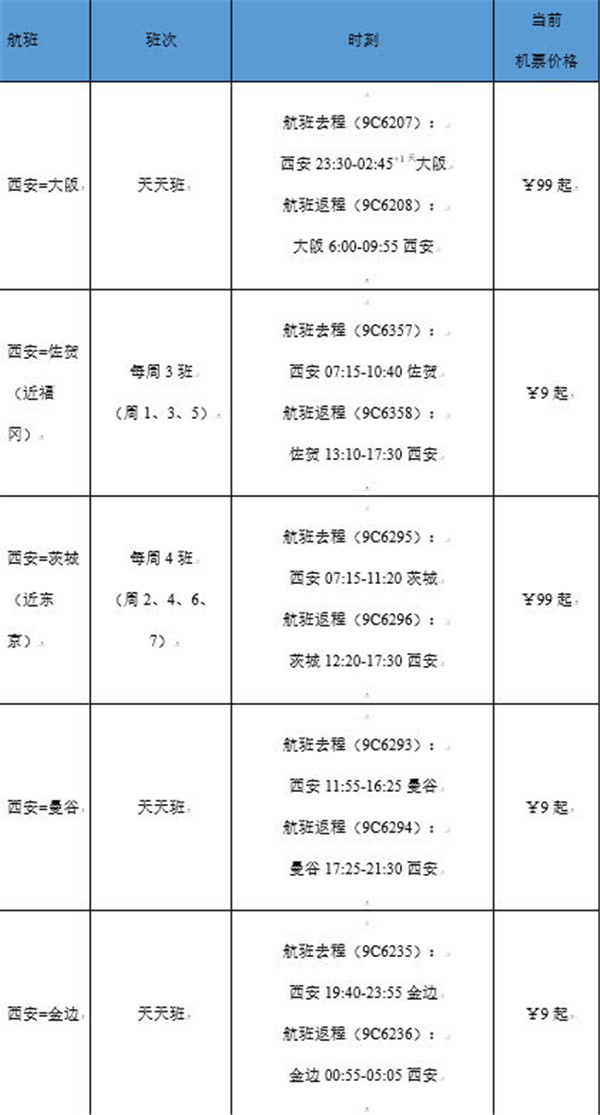 據(jù)了解,此次新開的航線及加密航線,將從2019年10月27日起陸續(xù)開始執(zhí)行,執(zhí)飛機(jī)型為空客A320。開航初期,機(jī)票價(jià)格相對(duì)優(yōu)惠,從春秋航空官網(wǎng)查詢到的價(jià)格來看,西安飛大阪、茨城(近東京)99元起(不含稅),西安飛佐賀(近福岡)、曼谷、金邊低至9元起(不含稅)。