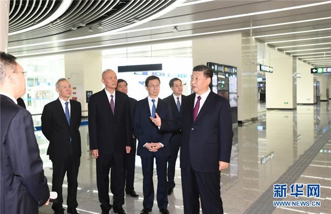 9月25日上午,北京大興國(guó)際機(jī)場(chǎng)投運(yùn)儀式在北京舉行。中共中央總書記、國(guó)家主席、中央軍委主席習(xí)近平出席儀式,宣布機(jī)場(chǎng)正式投運(yùn)并巡覽航站樓。這是習(xí)近平在軌道交通大興機(jī)場(chǎng)線草橋站進(jìn)站大廳,結(jié)合展板聽取情況介紹。 新華社記者 謝環(huán)馳 攝