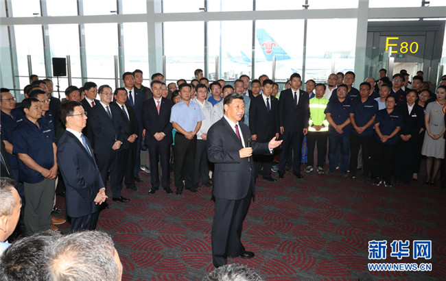 大興機(jī)場(chǎng)航站樓,是目前全球最大規(guī)模的單體航站樓,以其獨(dú)特的造型設(shè)計(jì)、精湛的施工工藝、便捷的交通組織、先進(jìn)的技術(shù)應(yīng)用,創(chuàng)造了許多世界之最。航站樓里,流線型的空間結(jié)構(gòu)十分寬敞明亮。習(xí)近平步行巡覽站臺(tái)大廳和值機(jī)大廳,實(shí)地了解值機(jī)、安檢、登機(jī)和殘疾人無障礙設(shè)施等情況,并結(jié)合沙盤和模型聽取機(jī)場(chǎng)總體規(guī)劃、設(shè)施建設(shè)等介紹。習(xí)近平強(qiáng)調(diào),大興國(guó)際機(jī)場(chǎng)是首都的重大標(biāo)志性工程,是推動(dòng)京津冀協(xié)同發(fā)展的骨干工程。京津冀三地要抓住機(jī)遇加強(qiáng)協(xié)同合作,加快推動(dòng)地區(qū)高質(zhì)量發(fā)展。民航業(yè)是國(guó)家重要的戰(zhàn)略產(chǎn)業(yè)。要建設(shè)更多更先進(jìn)的航空樞紐、更完善的綜合交通運(yùn)輸系統(tǒng),加快建設(shè)交通強(qiáng)國(guó)。