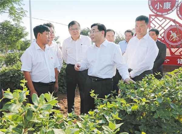 9月25日,省委書記胡和平來到蒲城縣堯山鎮(zhèn)閆家村金銀花現(xiàn)代農(nóng)業(yè)園區(qū),察看金銀花長(zhǎng)勢(shì),了解畝產(chǎn)、收益和帶動(dòng)脫貧致富效果。記者 宋紅梅攝