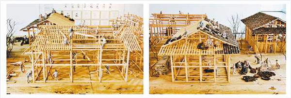 “作品分為動(dòng)工、排扇、立架、安梁、上椽、排瓦、裝修、入住8個(gè)部分,再現(xiàn)了中國(guó)民間木匠的工藝傳統(tǒng)和中國(guó)傳統(tǒng)民居營(yíng)建過(guò)程。”孫繼任介紹,為了讓作品呈現(xiàn)樸素而真實(shí)的美感,他們沒(méi)有在作品中運(yùn)用釘子或者新材料。“作品全部是純手工制作,建筑為榫卯結(jié)構(gòu),人物是手工塑造并用木柴燒制而成。”