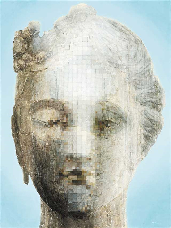 早在2017年,劉冠儒就開(kāi)始制作以中西方雕塑為主題的綜合材料繪畫(huà)作品,《融》則是他首次將東西方雕塑的形象融為一體。作品中的“維納斯”頭像,左邊為東方形象,右邊為西方形象,中間是馬賽克。馬賽克部分由300多個(gè)大小不同的紙板粘貼而成,作者在紙板上面反復(fù)打磨和暈染,形成豐富的肌理效果。