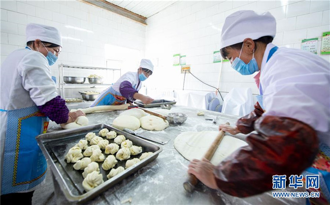 在西吉縣田坪鄉(xiāng)中心小學,食堂的工作人員在制作午餐面點(10月23日攝)。