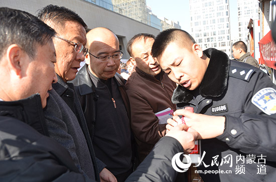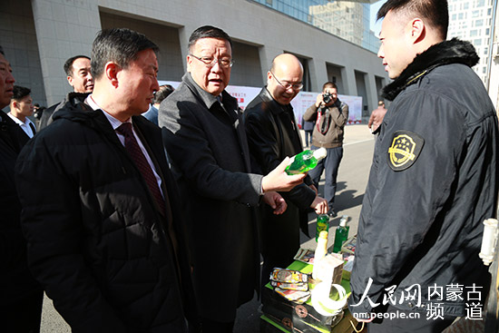 內(nèi)蒙古市場(chǎng)監(jiān)督管理局局長(zhǎng)白清元查看現(xiàn)場(chǎng)展示的假冒偽劣商品。