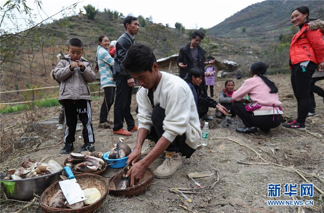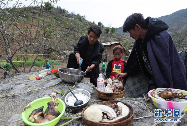 11月24日,在昭覺縣支爾莫鄉(xiāng)阿土列爾村,當(dāng)?shù)鼐用駵?zhǔn)備熟食、酒等食物祭祖,并相互贈送。