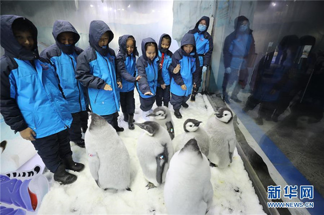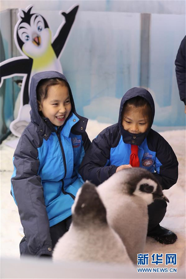 當(dāng)日,來自廣州和珠海的小學(xué)生代表來到珠海長隆海洋王國,參加企鵝關(guān)愛活動,零距離接觸今年新生的帝企鵝。本次活動旨在加強(qiáng)極地科普教育,提高小學(xué)生保護(hù)動物和呵護(hù)極地的意識。 新華社記者 盧燁 攝
