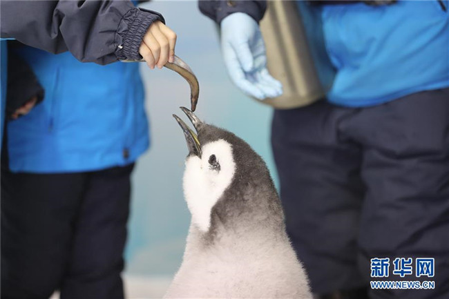 11月25日,小學(xué)生給帝企鵝喂食。