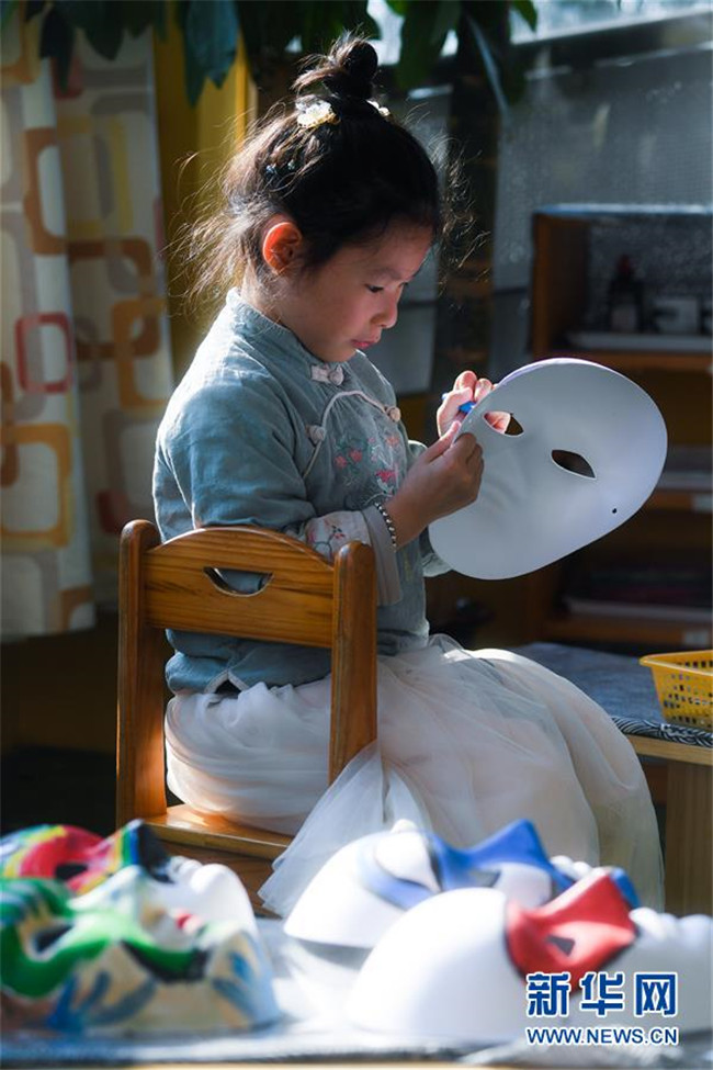 11月28日,小朋友在傳統(tǒng)書畫課上學(xué)習(xí)畫臉譜。