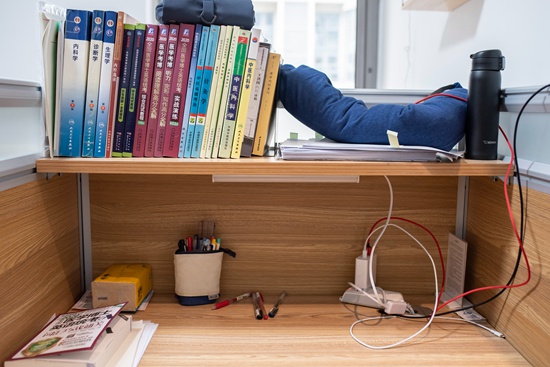 11月23日,北京望京一家自習室的座位。連續(xù)使用自習室的顧客,可以在這里儲存自己的物品。