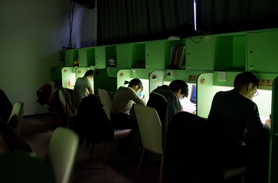 11月22日,北京中關村一家付費自習室內,顧客在“暗室”中學習。正值考研季,付費自習室里的多數(shù)顧客都是為考研而來。