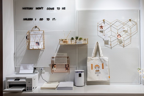 11月24日,北京定福莊一家自習室一角。這里為顧客提供打印服務和免費的紙張,一旁展示的是店家設計的帆布包。