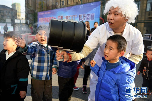 12月4日,科企社區(qū)小朋友在觀看“煙圈炮”小實驗。新華社記者 劉軍喜 攝