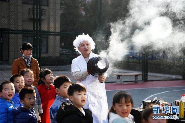 12月4日,科企社區(qū)小朋友在觀看“煙圈炮”小實驗。 新華社記者 劉軍喜 攝