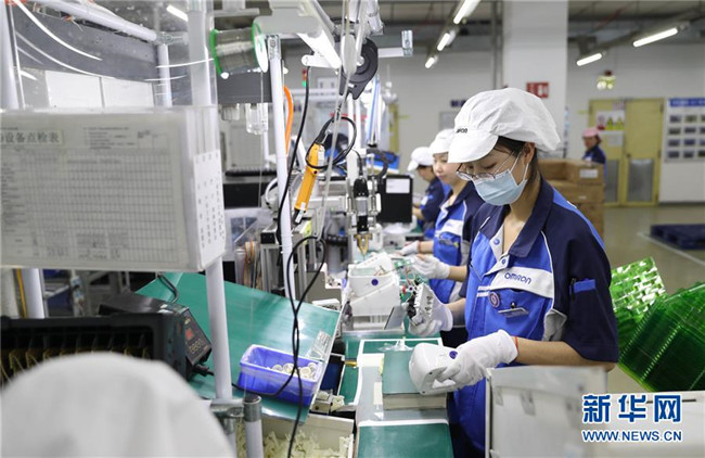 歐姆龍(大連)有限公司工人在車間工作(3月21日攝)。 新華社記者 楊青 攝