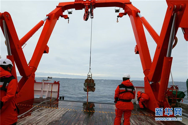 12月9日,科考隊員首次利用“雪龍2”號月池系統(tǒng)進(jìn)行CTD采水作業(yè)。 新華社記者 劉詩平 攝