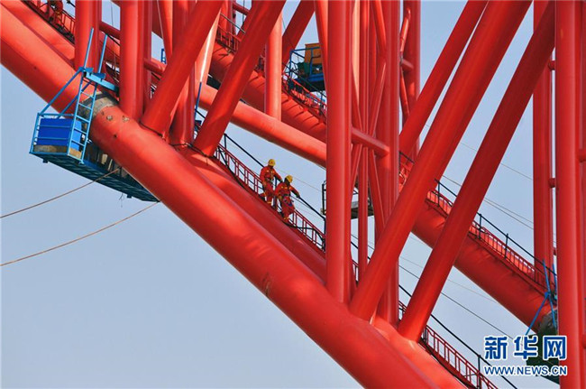 工人在進(jìn)行大橋主拱拱肋吊裝作業(yè)(12月8日攝)。