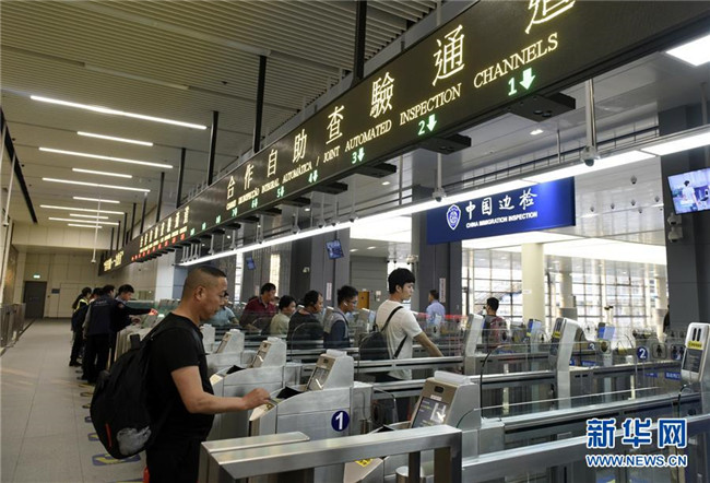 在港珠澳大橋澳門邊檢大樓,旅客從自助查驗(yàn)通道通關(guān)去往廣東珠海(11月21日攝)。新華社記者 徐亮 攝