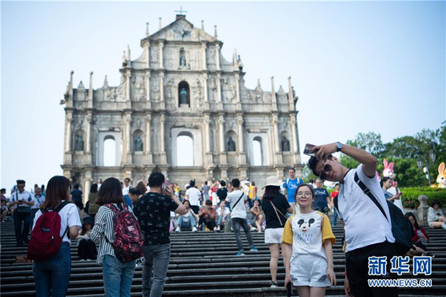 10月8日,人們?cè)诎拈T大三巴牌坊前游覽。新華社記者 張金加 攝