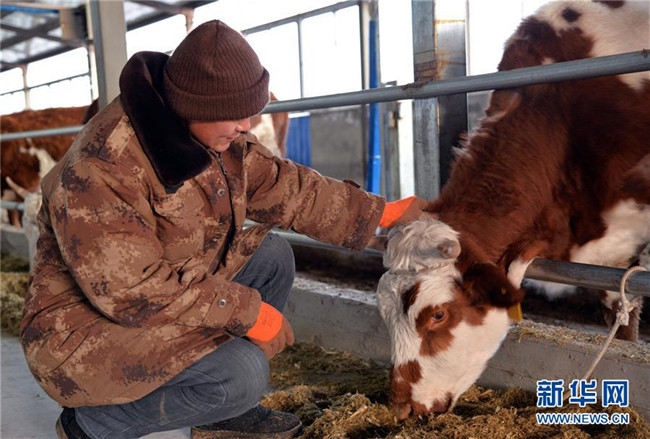 12月19日,科左后旗巴嘎塔拉蘇木劉金山養(yǎng)牛合作社的管理員劉德全在查看黃牛長勢(shì)。新華社記者徐欽攝