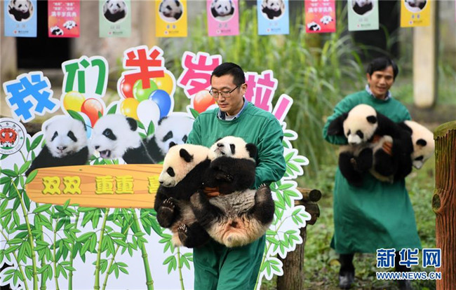 12月22日,重慶動(dòng)物園4只半歲大熊貓?jiān)趹敉饣顒?dòng)。當(dāng)日,重慶動(dòng)物園為4只大熊貓寶寶“雙雙”“重重”“喜喜”“慶慶”舉行半歲生日慶祝活動(dòng)。4只半歲大熊貓?jiān)陲曫B(yǎng)員的照料下,在熊貓館運(yùn)動(dòng)場(chǎng)內(nèi)玩耍、嬉戲,與市民游客一同過冬至。新華社記者唐奕攝