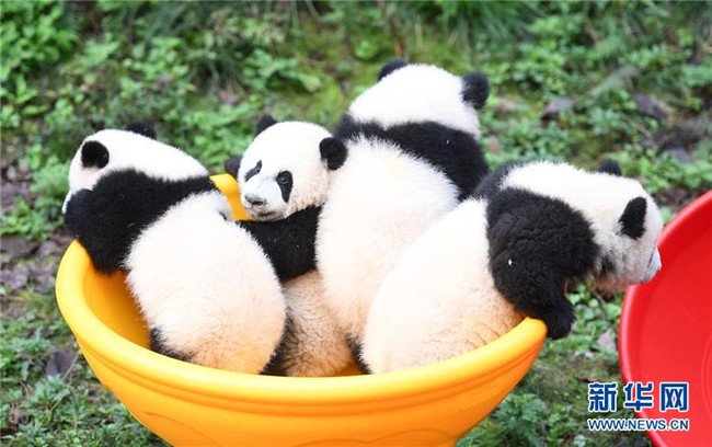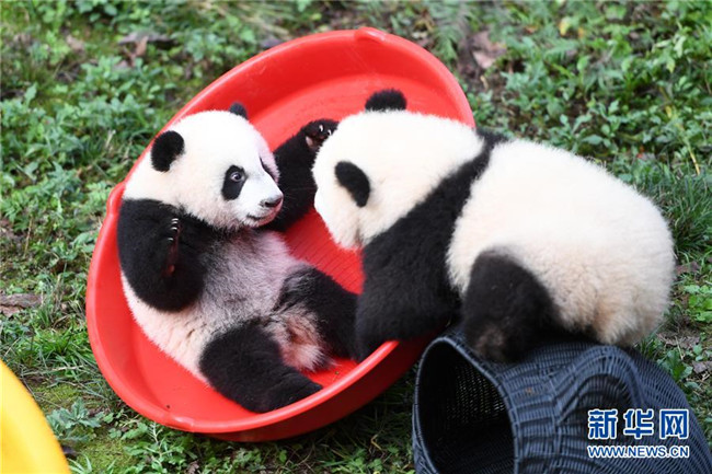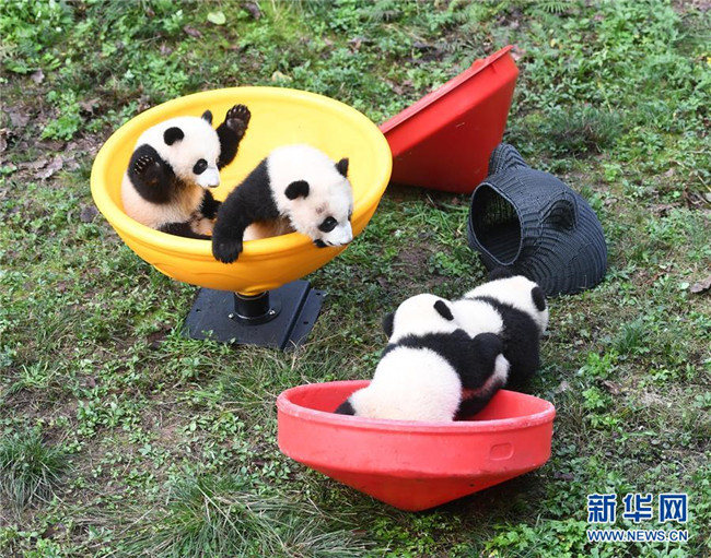 12月22日,重慶動(dòng)物園4只半歲大熊貓?jiān)谕嫠!.?dāng)日,重慶動(dòng)物園為4只大熊貓寶寶“雙雙”“重重”“喜喜”“慶慶”舉行半歲生日慶祝活動(dòng)。4只半歲大熊貓?jiān)陲曫B(yǎng)員的照料下,在熊貓館運(yùn)動(dòng)場(chǎng)內(nèi)玩耍、嬉戲,與市民游客一同過冬至。新華社記者唐奕攝