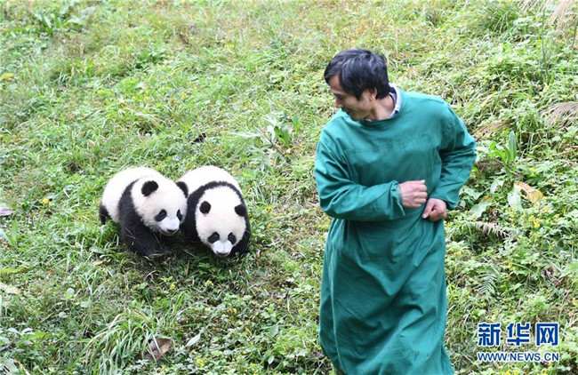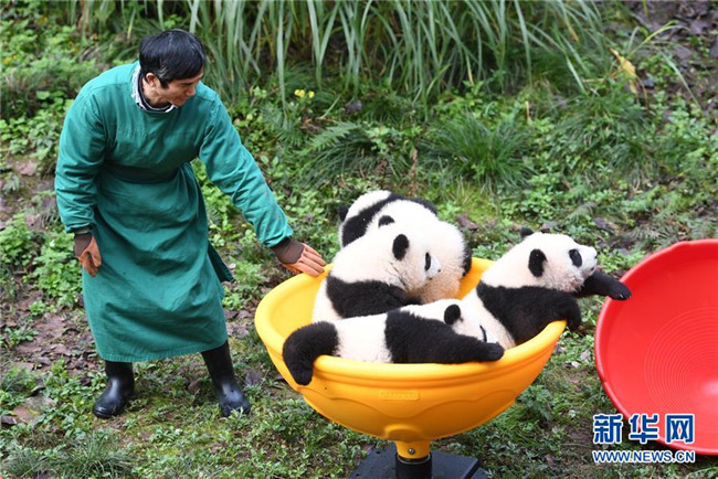 12月22日,飼養(yǎng)員引導(dǎo)大熊貓寶寶到戶外運(yùn)動(dòng)。當(dāng)日,重慶動(dòng)物園為4只大熊貓寶寶“雙雙”“重重”“喜喜”“慶慶”舉行半歲生日慶?;顒?dòng)。4只半歲大熊貓?jiān)陲曫B(yǎng)員的照料下,在熊貓館運(yùn)動(dòng)場(chǎng)內(nèi)玩耍、嬉戲,與市民游客一同過冬至。新華社記者唐奕攝