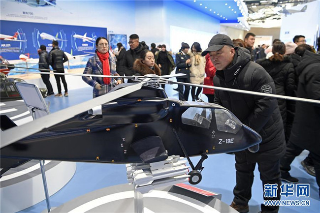 12月30日,觀眾在銀川航空館觀看展出的直升機模型。