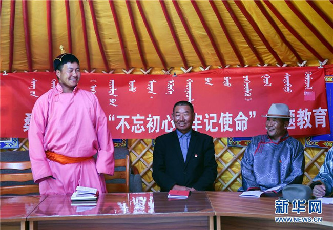 2019年10月11日,在內(nèi)蒙古自治區(qū)正藍(lán)旗恩克寶力格嘎查黨員中心戶的蒙古包中,黨員敖日格勒(左一)在回答知識競賽問題。新華社記者 劉磊 攝