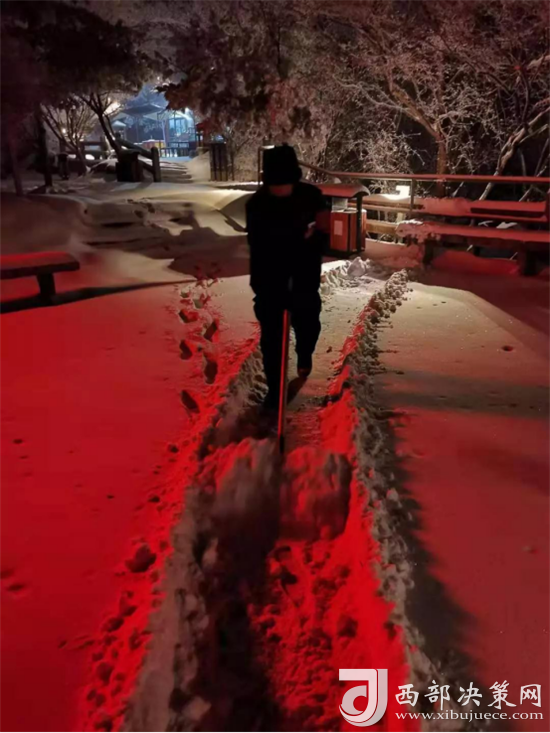清晨天未亮時,主峰區(qū)全體人員冒著嚴寒降雪已經(jīng)投入到清掃積雪的工作中。