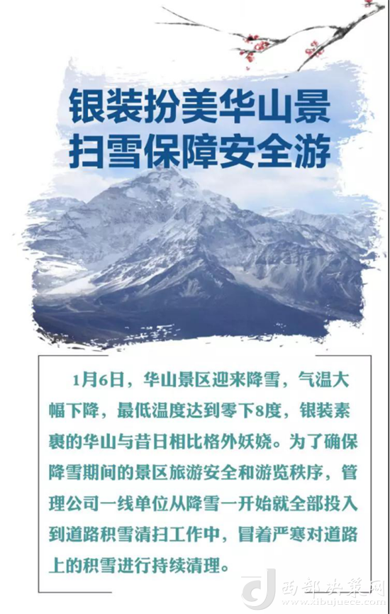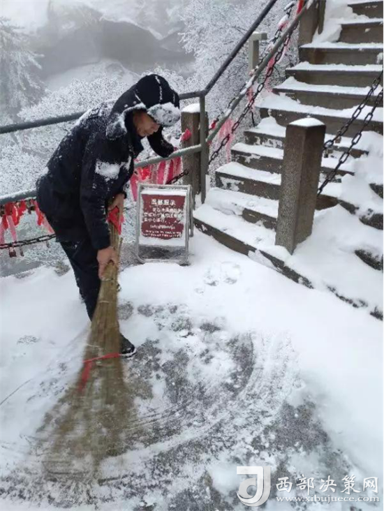 清晨天亮后,工作人員以常態(tài)化的工作要求持續(xù)對道路積雪進行細化清掃,防止路面結(jié)冰,發(fā)生安全事故。(供稿:華山景區(qū)管理公司)