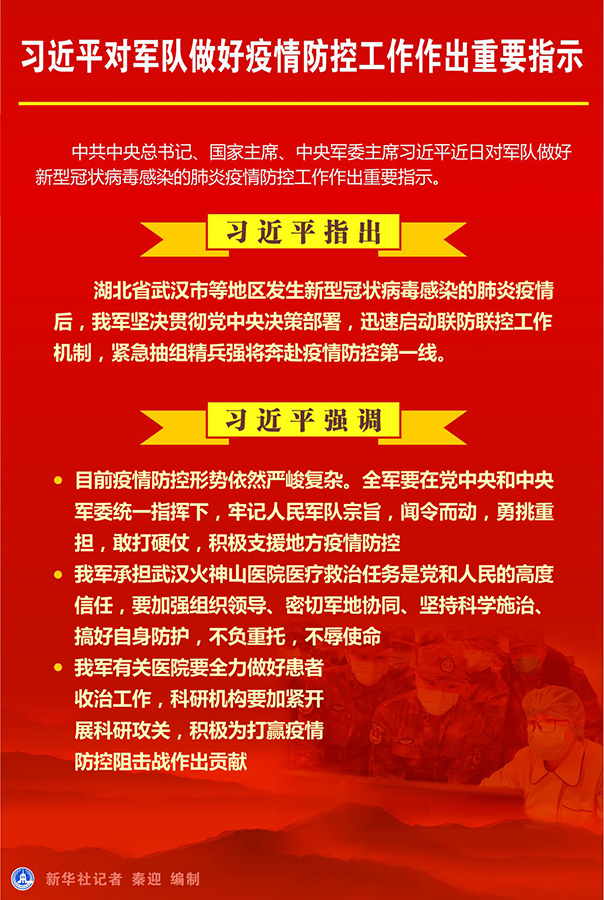 中共中央總書記、國家主席、中央軍委主席習(xí)近平近日對軍隊做好新型冠狀病毒感染的肺炎疫情防控工作作出重要指示。