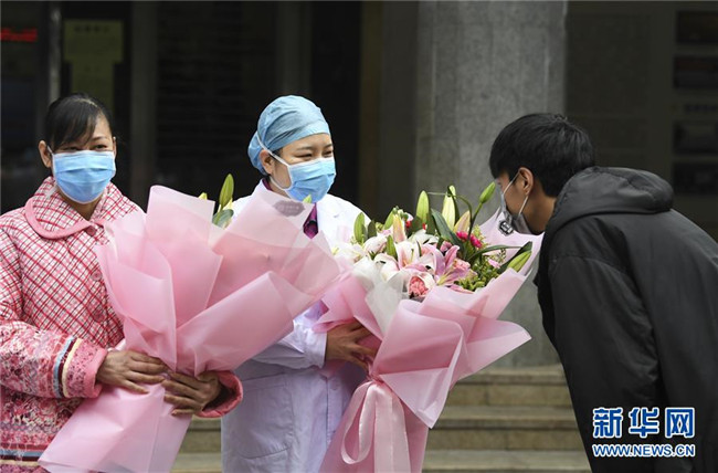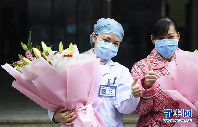 1月29日,在重慶三峽中心醫(yī)院,治愈患者蔣某的家屬(右)向主管護(hù)士送花表示感謝。 新華社記者王全超攝+
