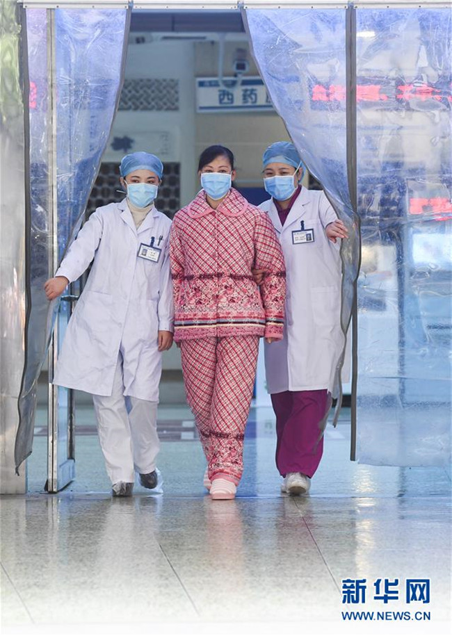 1月29日,在重慶三峽中心醫(yī)院,醫(yī)護(hù)人員護(hù)送治愈患者蔣某(中)出院。 新華社記者王全超攝