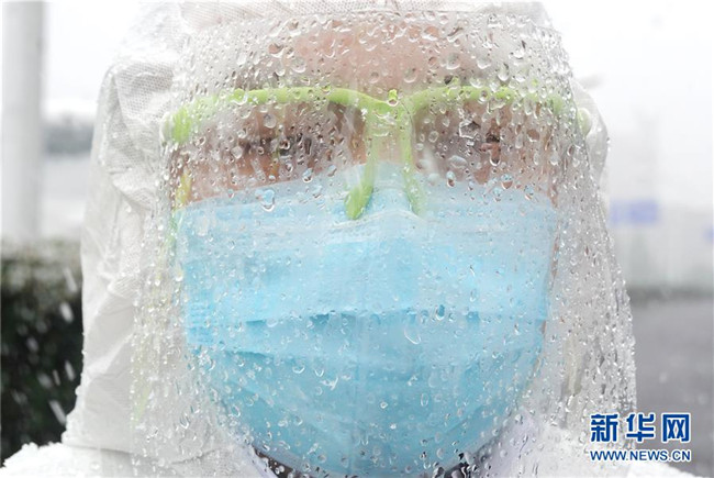 在武漢客廳方艙醫(yī)院,武漢市公安局東西湖區(qū)交通大隊快騎隊警務人員在現(xiàn)場執(zhí)勤。由于雨雪天氣,護目鏡上滿是霧水(2月15日攝)。 新華社記者 才揚 攝