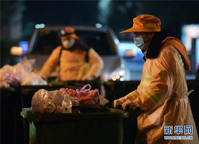 江岸環(huán)衛(wèi)集團工作人員在武漢街頭清運社區(qū)生活垃圾(2月1日攝)。 新華社記者 李賀 攝