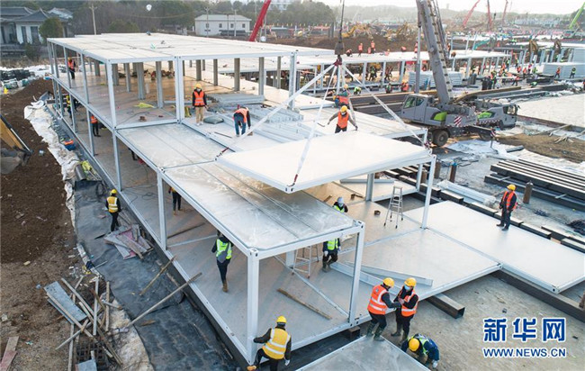 在武漢火神山醫(yī)院建設工地,來自中建三局的工人在加緊施工(1月28日攝,無人機照片)。 新華社記者 肖藝九 攝