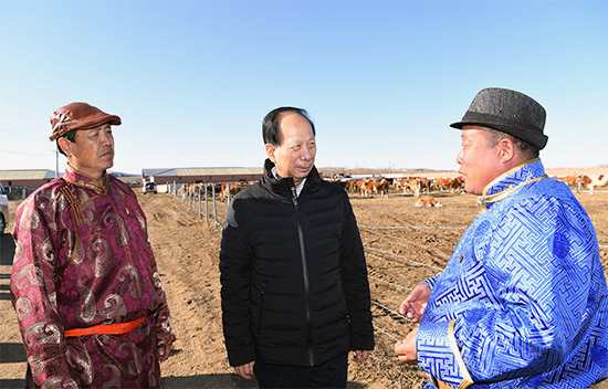 3月23日,自治區(qū)黨委書(shū)記、人大常委會(huì)主任石泰峰來(lái)到赤峰市克什克騰旗達(dá)來(lái)諾日鎮(zhèn)崗更嘎查西門(mén)塔爾牛養(yǎng)殖專(zhuān)業(yè)合作社,了解帶動(dòng)已脫貧戶(hù)穩(wěn)定長(zhǎng)效增收情況。內(nèi)蒙古日?qǐng)?bào)社融媒體記者 袁永紅 攝