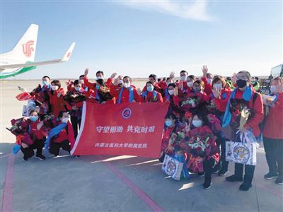 內(nèi)蒙古醫(yī)科大學(xué)附屬醫(yī)院的援鄂醫(yī)護(hù)人員在合影留念。