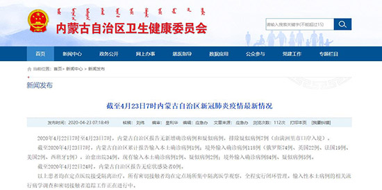 截至2020年4月23日7時(shí),內(nèi)蒙古自治區(qū)累計(jì)報(bào)告輸入本土確診病例1例;境外輸入確診病例118例(俄羅斯74例、英國(guó)22例、法國(guó)19例、美國(guó)2例、西班牙1例),治愈出院34例?,F(xiàn)有輸入本土確診病例1例、疑似病例2例;境外輸入確診病例84例、疑似病例5例。