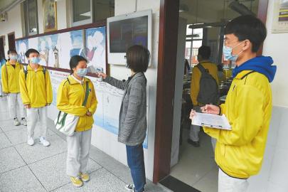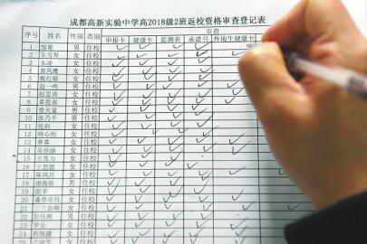 成都高新實驗中學工作人員對高2018級2班學生進行返校資格審查登記。