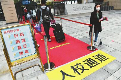 成都市教科院附中高一年級學生通過入校通道有序返校。