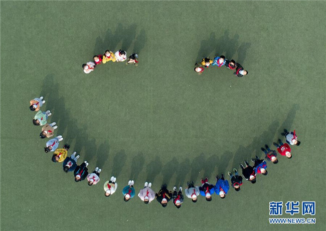 5月8日,江蘇省泰州市大馮中心小學(xué)學(xué)生在操場(chǎng)上拼出笑臉圖案(無人機(jī)照片)。 當(dāng)日是世界微笑日。 新華社發(fā)(湯德宏 攝)