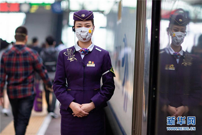5月8日,在南京火車站站臺(tái)上,一名列車員戴著“笑臉口罩”迎接旅客上車。 當(dāng)日是世界微笑日。 新華社發(fā)(蘇陽 攝)