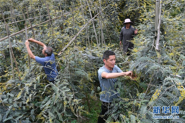 在廣西環(huán)江毛南族自治縣下南鄉(xiāng)下塘村,毛南族村民在管護種植的中草藥(5月13日攝)。