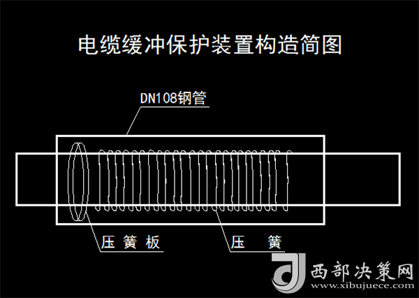 為了解決這一難題,該工區(qū)組織人員經(jīng)過多次試驗研討后,決定將DN108鋼管作為緩沖裝置的外管,將加工好的壓板與中間軸焊接在一端做成壓簧盤,再將加工好的2寸法蘭盤焊接在DN108管一端,將壓簧放入DN108鋼管內(nèi),穿入中間軸。用加工好的2寸法蘭盤封閉DN108鋼管另一端,在中間軸的一端安裝加工好的電纜導向輪,并安裝在固定架上。雙電纜卡子固定電纜可根據(jù)使用長度調(diào)整導向輪,隨著梭車的行走方向而改變電纜方向,避免電纜彎曲打折;利用彈簧彈性,發(fā)揮緩沖作用,將拉力轉(zhuǎn)化為彈性勢能,減少對電纜的損害。