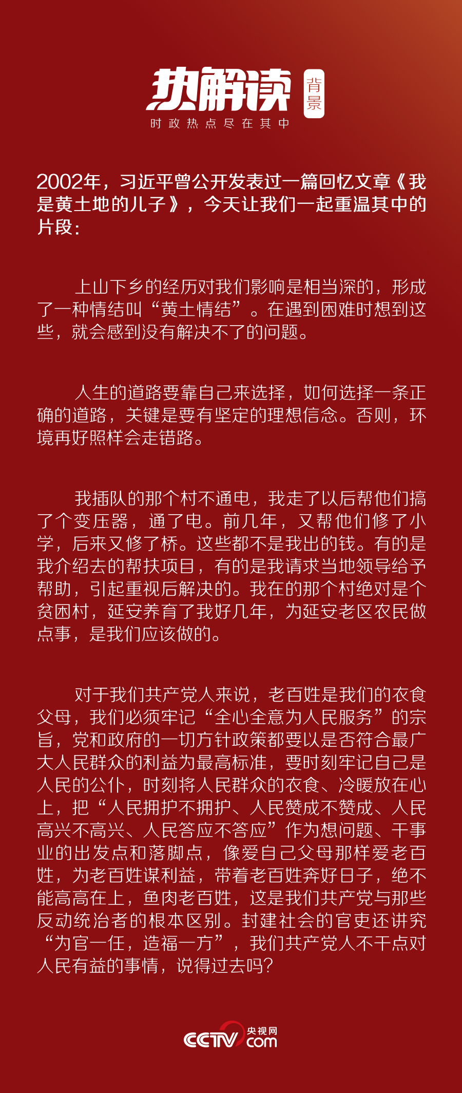 早在十幾年前,習近平就曾在《我是黃土地的兒子》一文中提到過“情結”二字。他說,上山下鄉(xiāng)的經歷對我們影響是相當深的,形成了一種情結叫“黃土情結”。