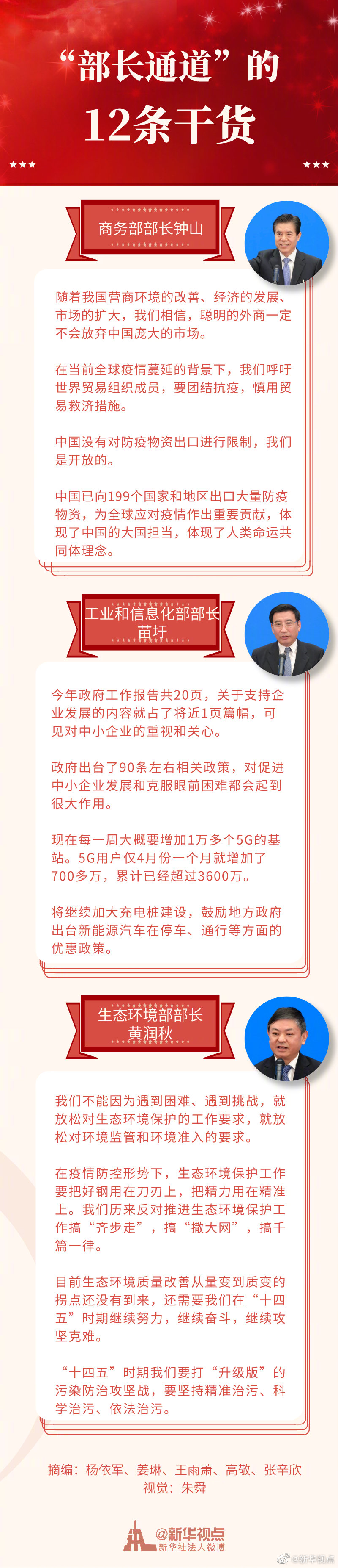 原標(biāo)題:今天的“部長(zhǎng)通道”,12條干貨! 5月25日,商務(wù)部部長(zhǎng)鐘山、工業(yè)和信息化部部長(zhǎng)苗圩、生態(tài)環(huán)境部部長(zhǎng)黃潤秋亮相全國兩會(huì)“部長(zhǎng)通道”。新華視點(diǎn)微博為你總結(jié)了12條干貨,請(qǐng)看↓