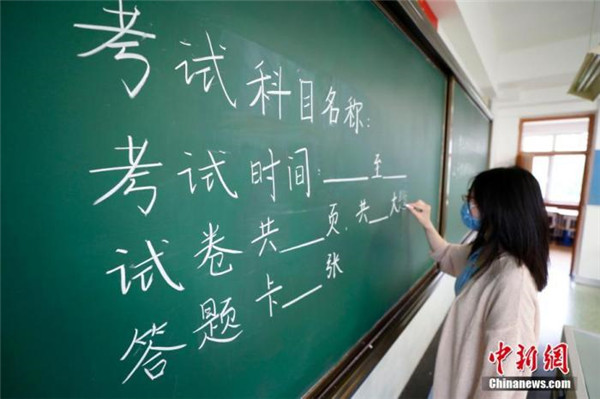 7月3日,北京十二中老師布置考場(chǎng)。該校共設(shè)標(biāo)準(zhǔn)考場(chǎng)33間,備用考場(chǎng)3間,將有660名考生在此考試。 中新社記者 富田 攝