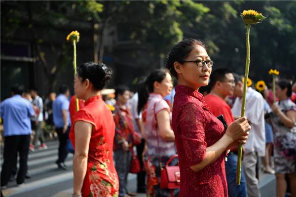 ▲考場(chǎng)外的家長(zhǎng)穿著旗袍,手舉向日葵,寓意“旗開(kāi)得勝”“一舉奪魁”。圖片來(lái)源:中新社