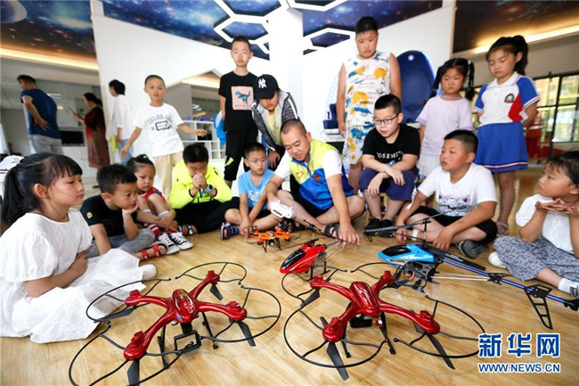 7月12日,山東省青島市即墨區(qū)環(huán)秀街道濱湖社區(qū)科普館工作人員在給小學生講解無人機飛行常識。新華社發(fā)(梁孝鵬 攝)